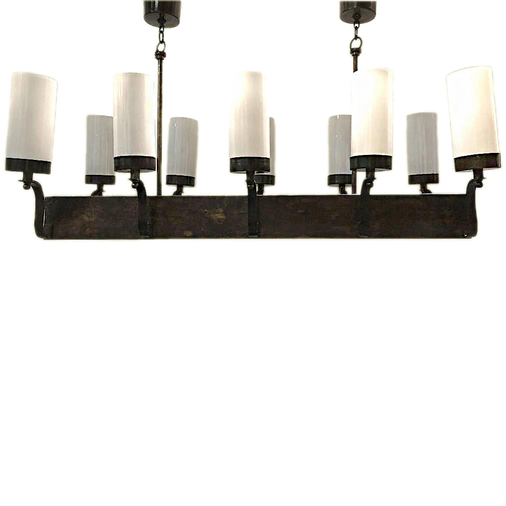 French circa 1950’s horizontal chandelier patinated bronze finish and opaline glass cylindrical globes.