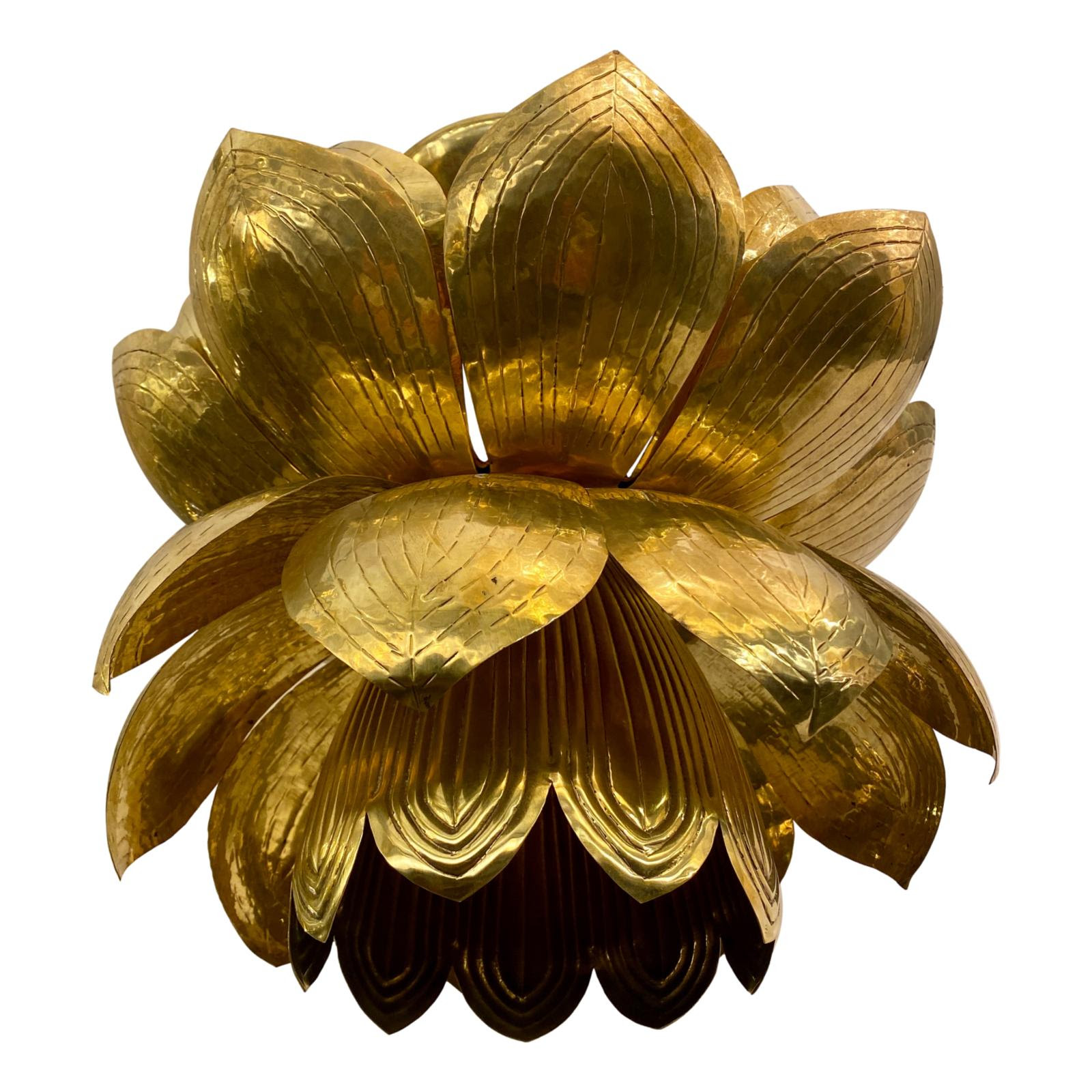 A set of six circa 1960’s Italian lotus flower repoussé brass light fixtures with three interior lights.